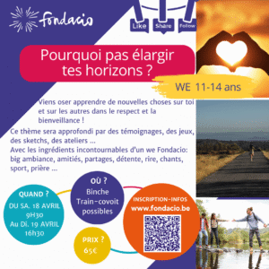 Le prix du we est de 65€ (Il comprend, entre autres, le logement, la nourriture, le matériel, les assurances, les frais administratifs, la location des salles…) à verser sur le compte de Fondacio Jeunes BE41 3101 3654 9010 avec la mention « we 11-14 ans – avril + nom et prénom du participant ». Le prix ne doit pas être un obstacle à ta participation. Il est possible de demander une bourse lors de ton inscription.